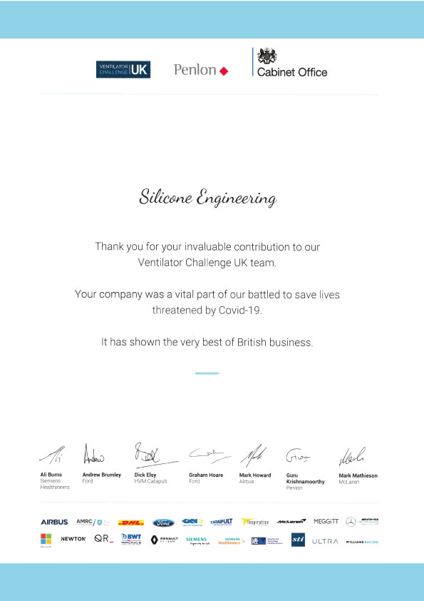 Silicone Engineering is excited to announce that we have been presented with the Covid-19 supply chain certificate for its contribution towards the Ventilator Challenge UK.